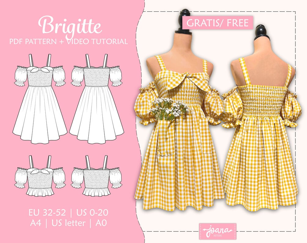 Patrón Gratis de Vestido fruncido con lazo | BRIGITE | 11 Tallas/ 11 Sizes | PDF A4-LETTER-A0 | Dress & Peplum Top