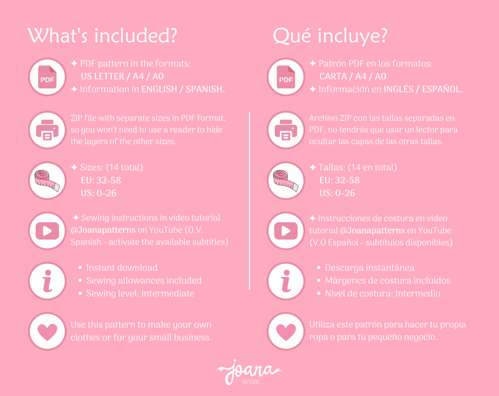 - Archivo ZIP con cada talla separada en PDF (A4 y US Letter) No será necesario ocultar ninguna capa para imprimir.